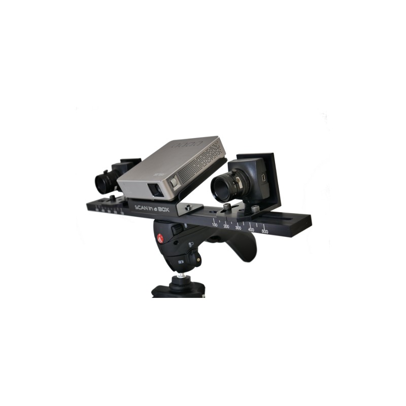 Scan in a Box est un produit modulaire et polyvalent. Il est composé d'une barre en aluminium, dans laquelle sont gravées les positions préétablies pour les caméras, qui tient les trois stands: celui du milieu est pour le projecteur et doit être rigidement fixé, les deux sur les côtés sont pour le caméras, dont la largeur peut être définie pour établir la zone de numérisation.