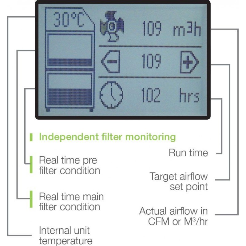 - Surveillance indépendante de l'état du filtre, affichage et avertissements