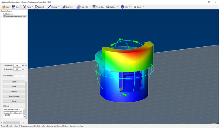 XRIZE exploite le processus hybride de dépôt augmenté Augmenter de RIZE en extrudant notre composé exclusif de thermoplastique de qualité technique et en projetant simultanément les encres C, M, Y, K (cyan, magenta, jaune et noir) à travers les têtes d'impression industrielles, là où elles sont nécessaires pour obtenir la couleur complète. partie. L'encre Release Ink est projetée entre la pièce et ses supports générés automatiquement pour permettre à l'utilisateur de retirer rapidement les supports de la pièce, laissant une finition de surface lisse et évitant ainsi le besoin d'une finition supplémentaire. Avec le logiciel RIZE OneTouch, les utilisateurs peuvent rapidement et facilement appliquer du texte, des images et des textures sur des fichiers de pièce monochromes ou importer des fichiers de CAO couleur.