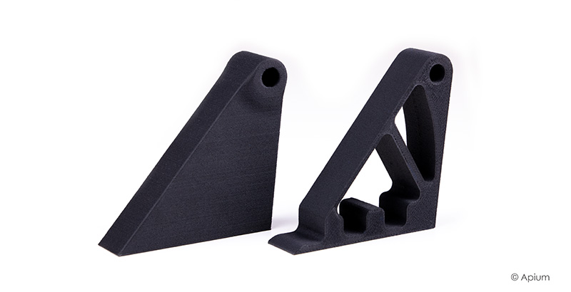 Étant donné que le PEEK peut potentiellement remplacer les métaux dans des applications légères sur une plage de températures (généralement de -196 ° C à 260 ° C), la technologie Apium PEEK et 3D Print est intéressante pour une production légère. L'utilisation de conceptions assistées par ordinateur, qui mettent l'accent sur les géométries organiques et les architectures cachées dans les pièces, entraîne moins de contraintes internes et réduit la masse globale. L'image montrée sur la photo suivante est une parenthèse optimisée par topologie fabriquée avec Apium CFR PEEK, où les experts d'Apium pourraient réaliser une réduction globale de poids de 43%.
