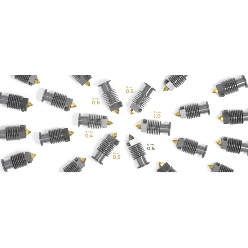 Un hotend adapté à chaque instant: imprimez le modèle le plus petit ou le plus grand, utilisez des filaments abrasifs pour matérialiser votre pièce fonctionnelle ou profitez au mieux du système IDEX en combinant différentes tailles de buses. (Vendu séparément)