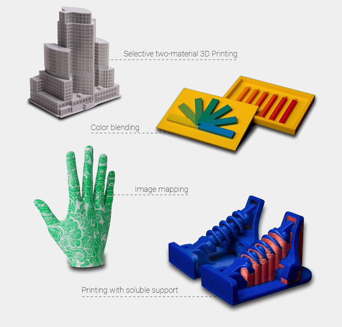 Impression 3D de qualité supérieure avec fonctions avancées d'impression à deux matériaux, telles que le mappage d'images et le mélange de couleurs