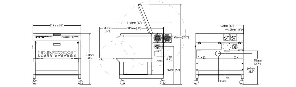 Tous les lasers d’Universal sont refroidis par air avec des ventilateurs contrôlés par ordinateur. La vitesse du ventilateur diminue ou augmente en fonction de la température du laser, afin de réduire les niveaux de bruit lors de l’utilisation des lasers à puissance réduite.