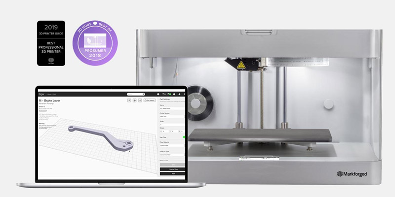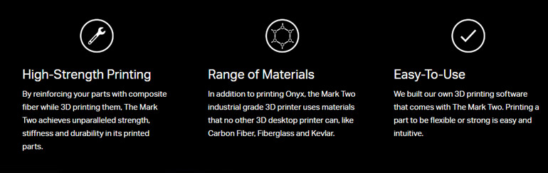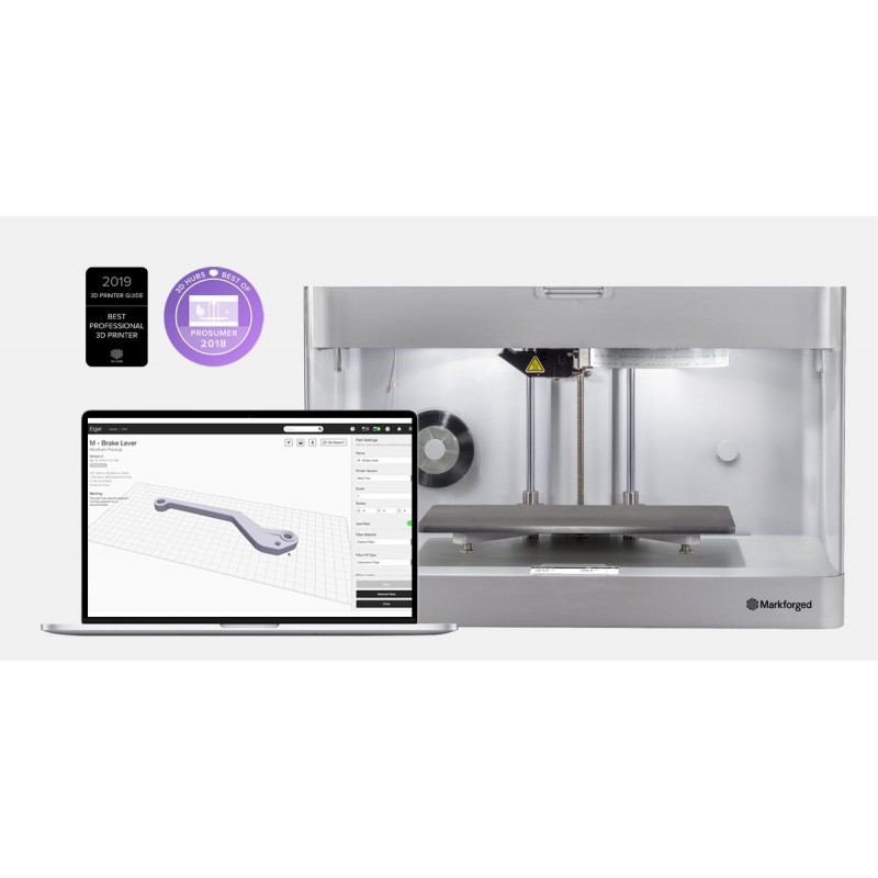 | Inclus | Imprimante 3D Mark Two Gen.2 Dry box Accès au Cloud Eiger Bobine 800cc Onyx fibre de carbone 100cc fibre de kevlar 50cc fibre de verre 50cc fibre de verre HT 50cc 1 plateau TrueBed |