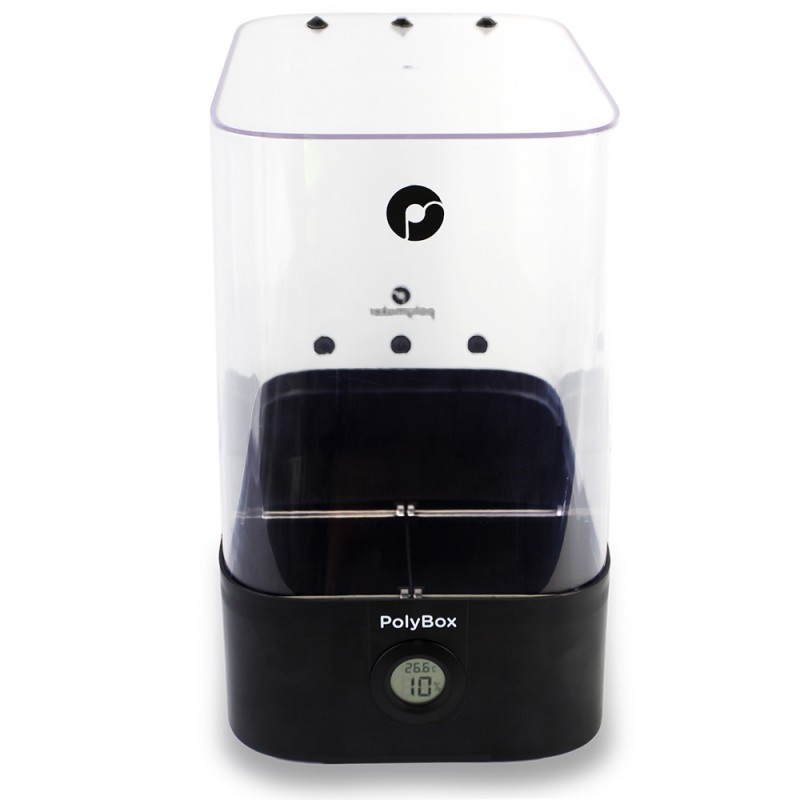 PolyBox ™ comporte un thermo-hygromètre pour surveiller vos filaments à l'intérieur de la boîte. L'humidité est régulée par de grands sacs déshydratants qui absorbent l'humidité de l'air à l'intérieur du PolyBox ™, spécialement conçu pour les matériaux hygroscopiques tels que PolySmooth ™, PVA ou Nylon. Le PolyBox ™ peut contenir deux bobines de 1 kg simultanément ou une bobine de 3 kg et est compatible avec les diamètres de filament de 1,75 mm et 2,85 mm.